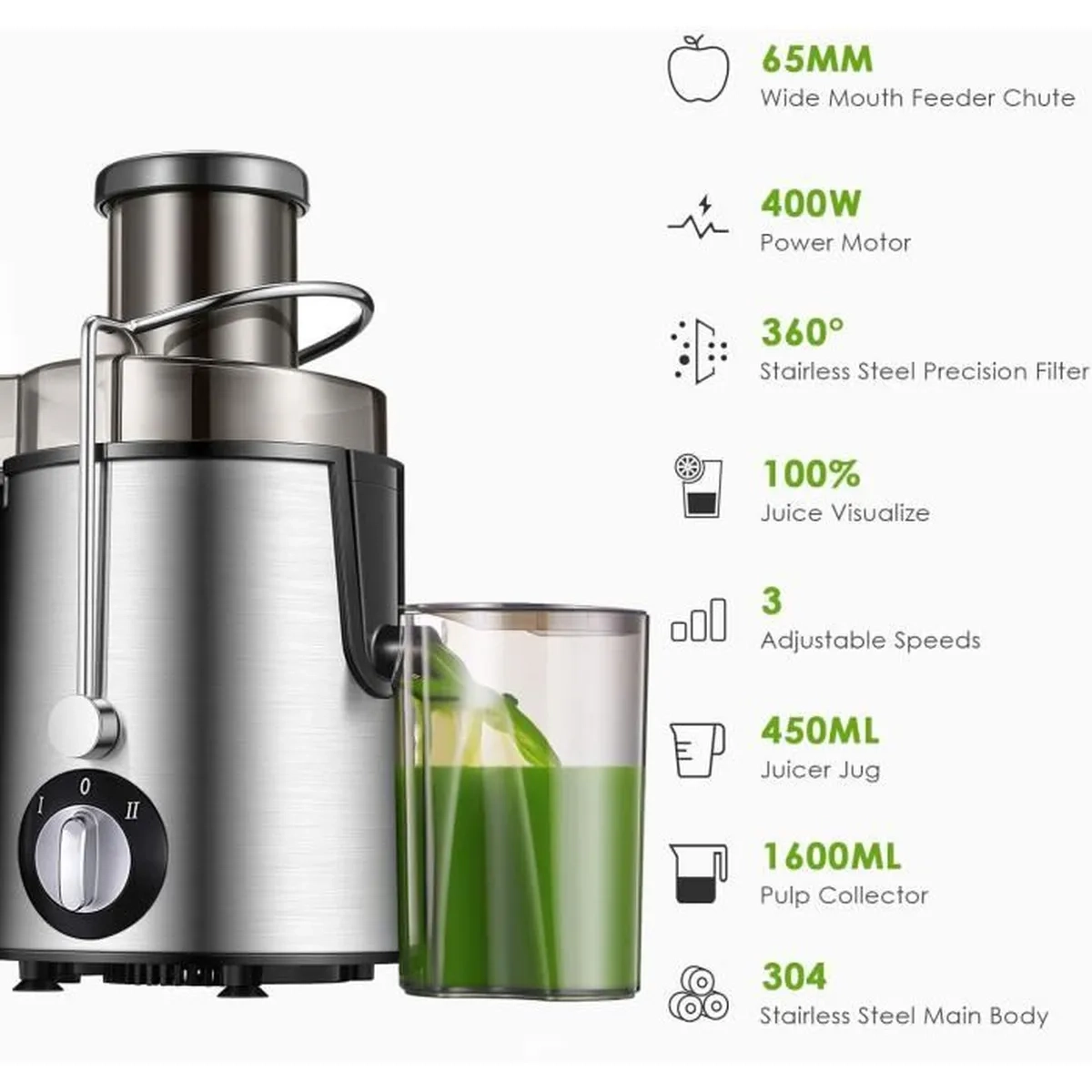Extracteur de Jus Électrique 450 ml – Acier Inox, 2 Vitesses, Design Anti-goutte